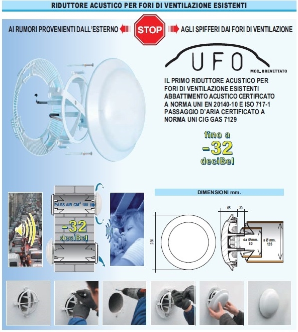 Il riduttore acustico UFO consente un abbattimento acustico di 32 dB per ogni foro di ventilazione esistente.