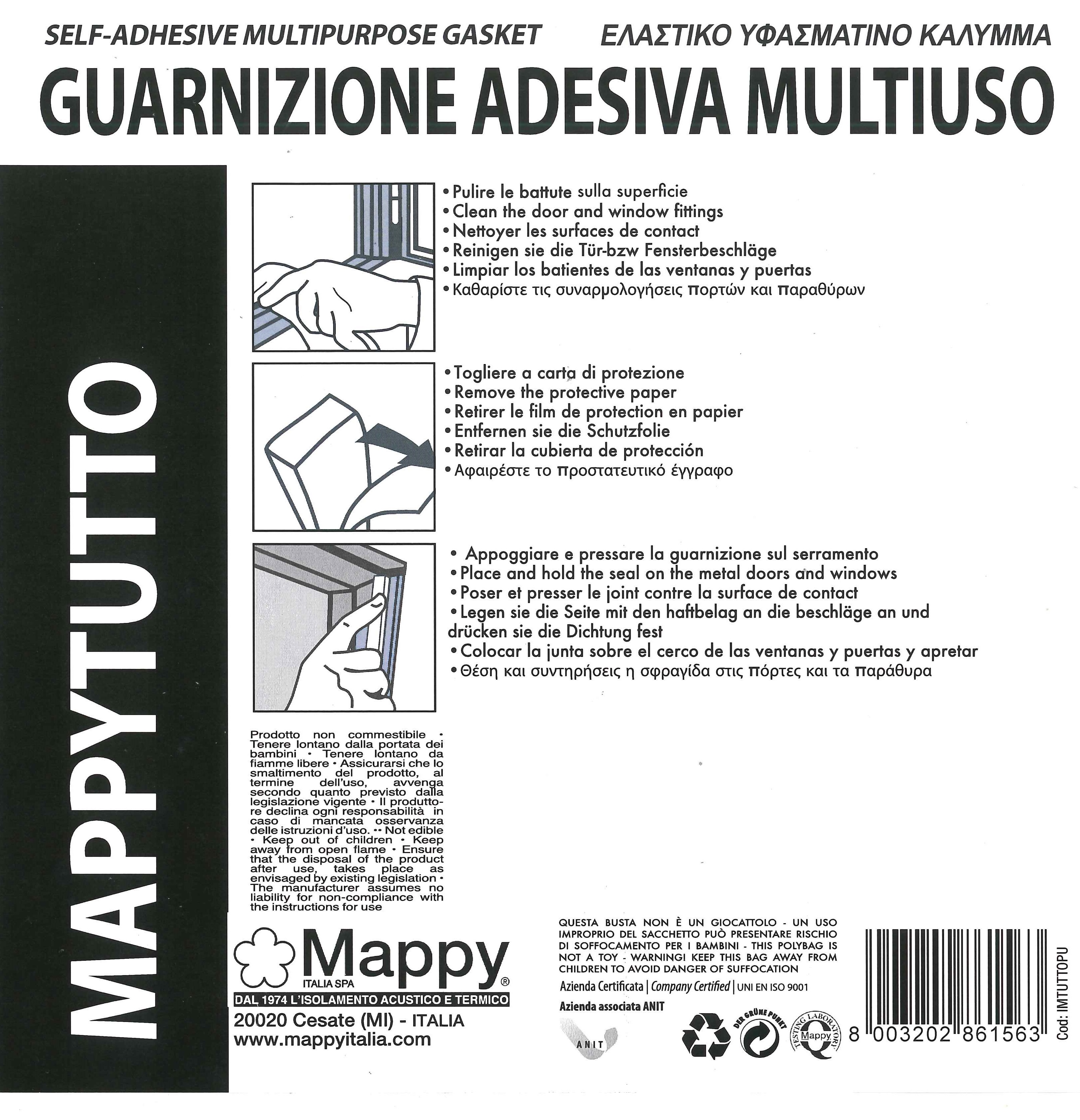 Guarnizione adesiva in poliuretano; rispetto alle convenzionali schiume di poliuretano, MAPPYTUTTO presenta una resistenza all’umidità; studiata ad hoc per porte basculanti di zone cantine, garage e locali caldaia, evita correnti d’aria calda/fredda e infiltrazioni di polvere, isola dai rumori provenienti dall’esterno e viceversa; durata = 3 anni.