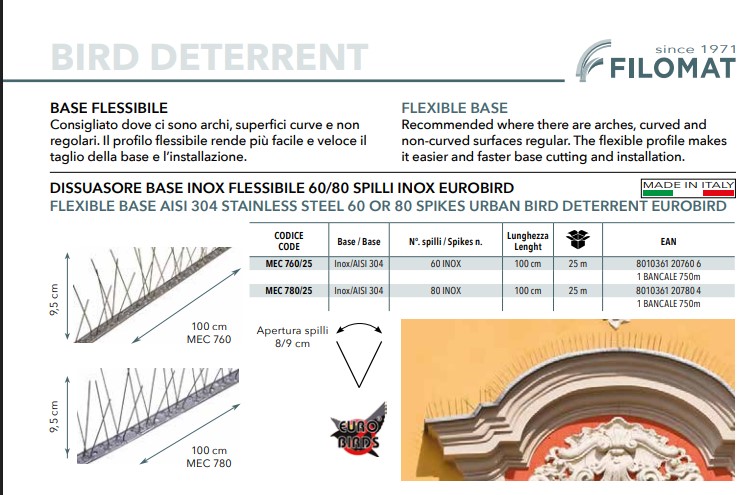 Scatola da 25 pezzi (1 ml cad.) di dissuasori per volatili plurispillo in acciaio Inox con base flessibile; 80 punte per metro; le punte sono arrotondate (diametro 1,3 mm), disposte alternativamente, trasversali e longitudinali alla base, Base con notevole flessibilità e facilmente sezionabile. Nr. 80 punte per metro lineare.